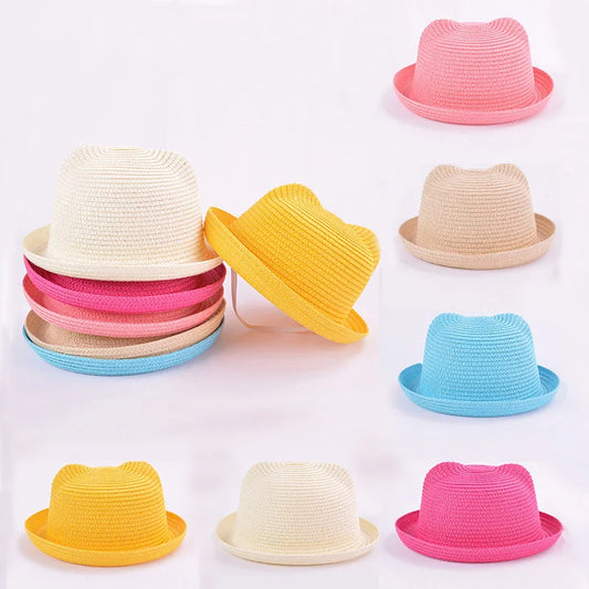 Sød børne stråhat med ører til solbeskyttelse om sommeren